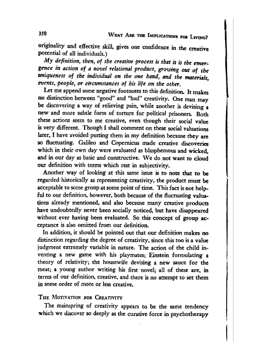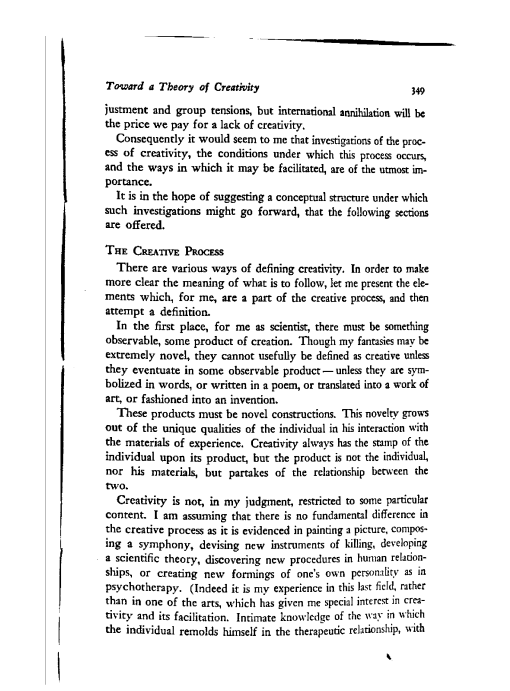 (...) "My definition then, of the creative process is that it is the emergence in action of a novel relational product, growing out of the uniqueness of the individual on the one hand, and the materials, events, people or circumstances of his life on the other" (page 350, ― Carl R. Rogers, On Becoming a Person: A Therapist's View of Psychotherapy